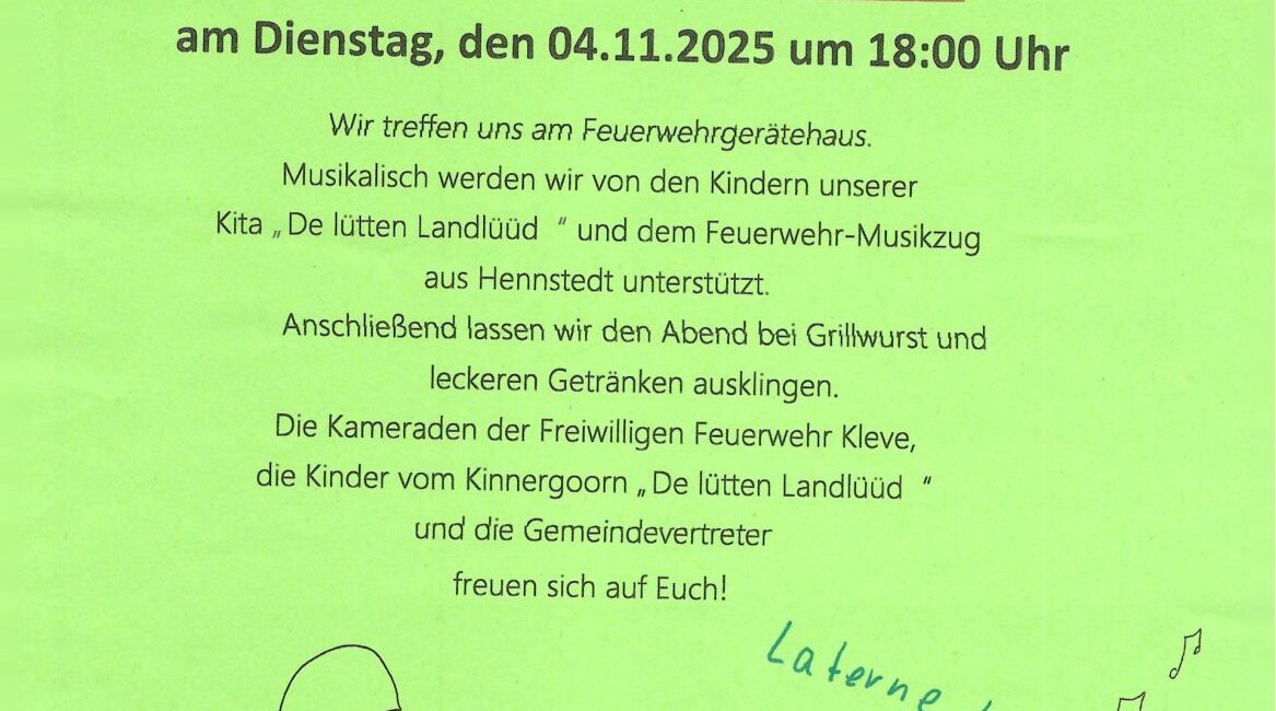 Am Dienstag, den 4. November 2025, lädt der Kinnergoorn „De lütten Landlüüd“ e.V. gemeinsam mit der Freiwilligen Feuerwehr Kleve und dem Feuerwehr-Musikzug Hennstedt herzlich zum Laternenumzug ein.